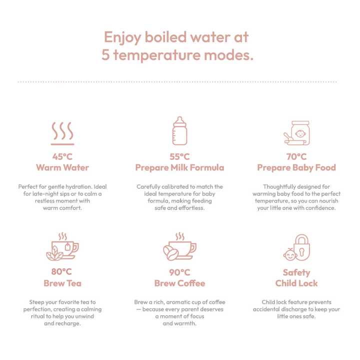 Your new countertop multitasker to make life simpler, our Snuugo DuoCare UV Steriliser & Water Dispenser dispenses boiled water at 5 different temperature modes, while UV sterilising bottles, pump parts and everyday items. Let Snuugo DuoCare be your trusty mate through your child’s growing years, giving you and your family more options, less clutter.